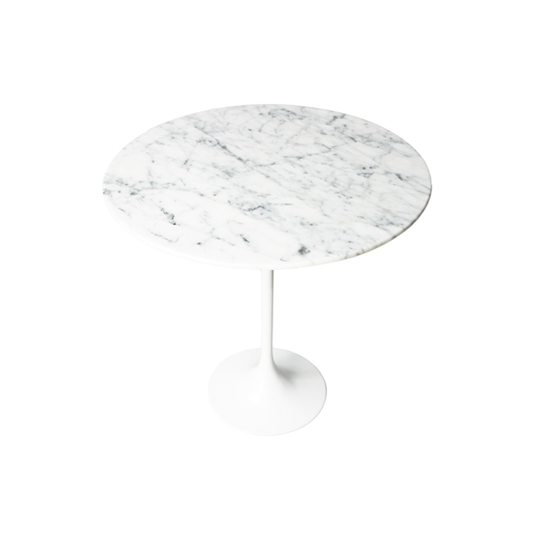 The Tulip Side Table is inspired by the famous, innovative design of Eero Saarinen. Saarinen is widely considered one of the great masters of 20th century architecture. This piece is characterized by the elegance of its simplicity and smooth form. The central base is made of white lacquered cast aluminum and allows plenty of leg room. The marble top is made of beautifully finished Italian marble. This side table comfortably accommodates 2-3 persons.